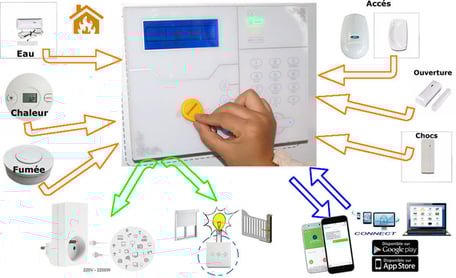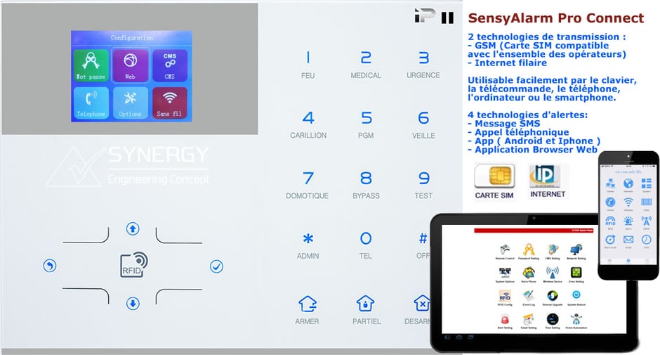En cas d’intrusion, inondation, incendie, SensyAlarm reçoit des messages de la part des éléments de détection et déclenche tous les moyens de dissuasion. La centrale permet également de commander à distance des appareils électriques ou des éclairages par l’intermédiaire de n’importe quel téléphone (portable ou fixe, vocal ou SMS) ou avec l'application PC ou Smartphone (Android ou iPhone).